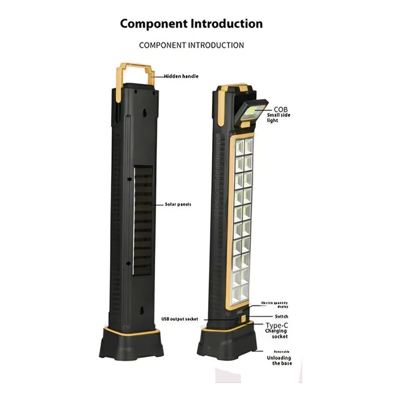 Lámpara y luz solar. -Cuerpo duradero hecho de materiales calidad, tiene una base para luces estáticas en la mesa y superficies lisas. - Equipado con 48 lámparas LED y una lámpara COB, la potencia de salida de la lámpara COB es igual a 2 vatios. -Color de luz de luces LED y LED fluorescentes y luces COB con luz de luna. -Modo de exposición de las luces LED como fijo débil (fuerte) y fijo (soleado). -Lámpara COB con modo de exposición débil y fuerte, alimentada por batería de litio interna. -Capacidad de la batería 3600 mAh, el tiempo de carga de la batería es de aproximadamente 15 horas la primera vez y la próxima vez de 8 a 12 horas. -Posibilidad de recargar la batería a través del puerto micro USB y cable móvil o panel solar en el cuerpo. -Tiene un indicador LED, equipado con un puerto USB para carga de emergencia de teléfonos móviles. -Equipado con una botón físico para encender y apagar las luces, cambiar el modo de exposición y alternar entre las luces. -Con asa plegable para colgar la lámpara o fácil de transportar, equipada con ranura para clavos/tornillos para fijar la lámpara a la pared.